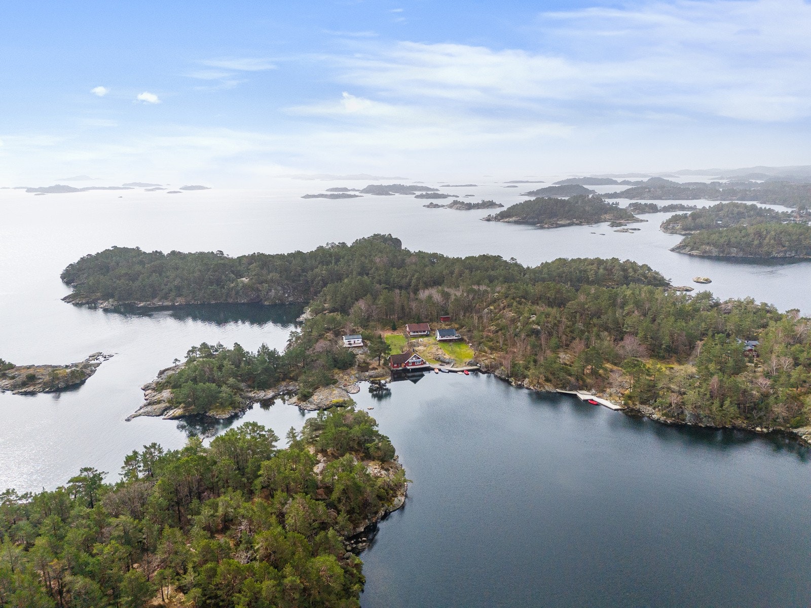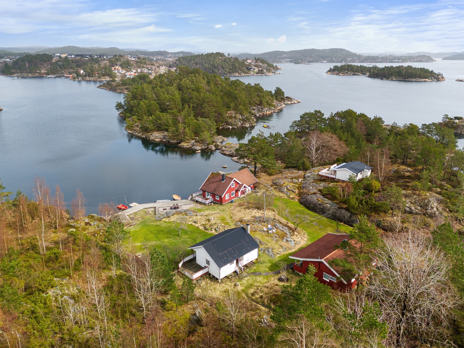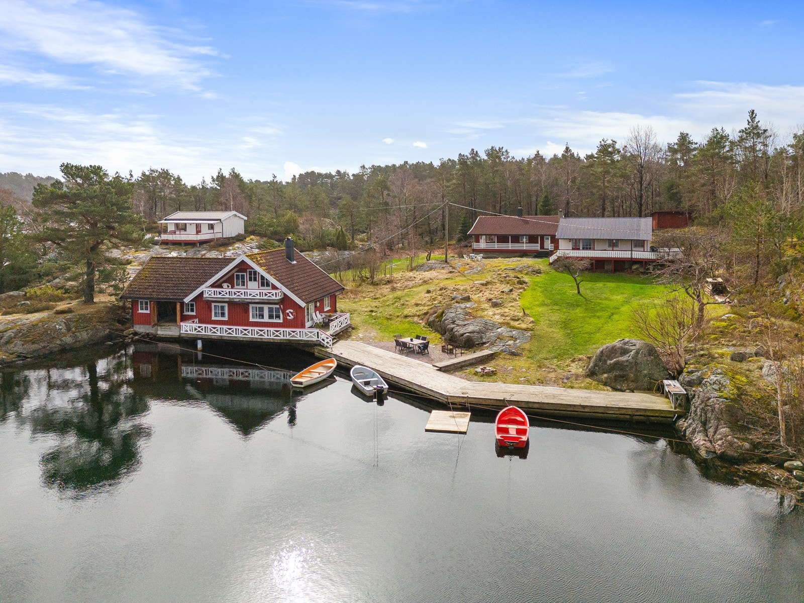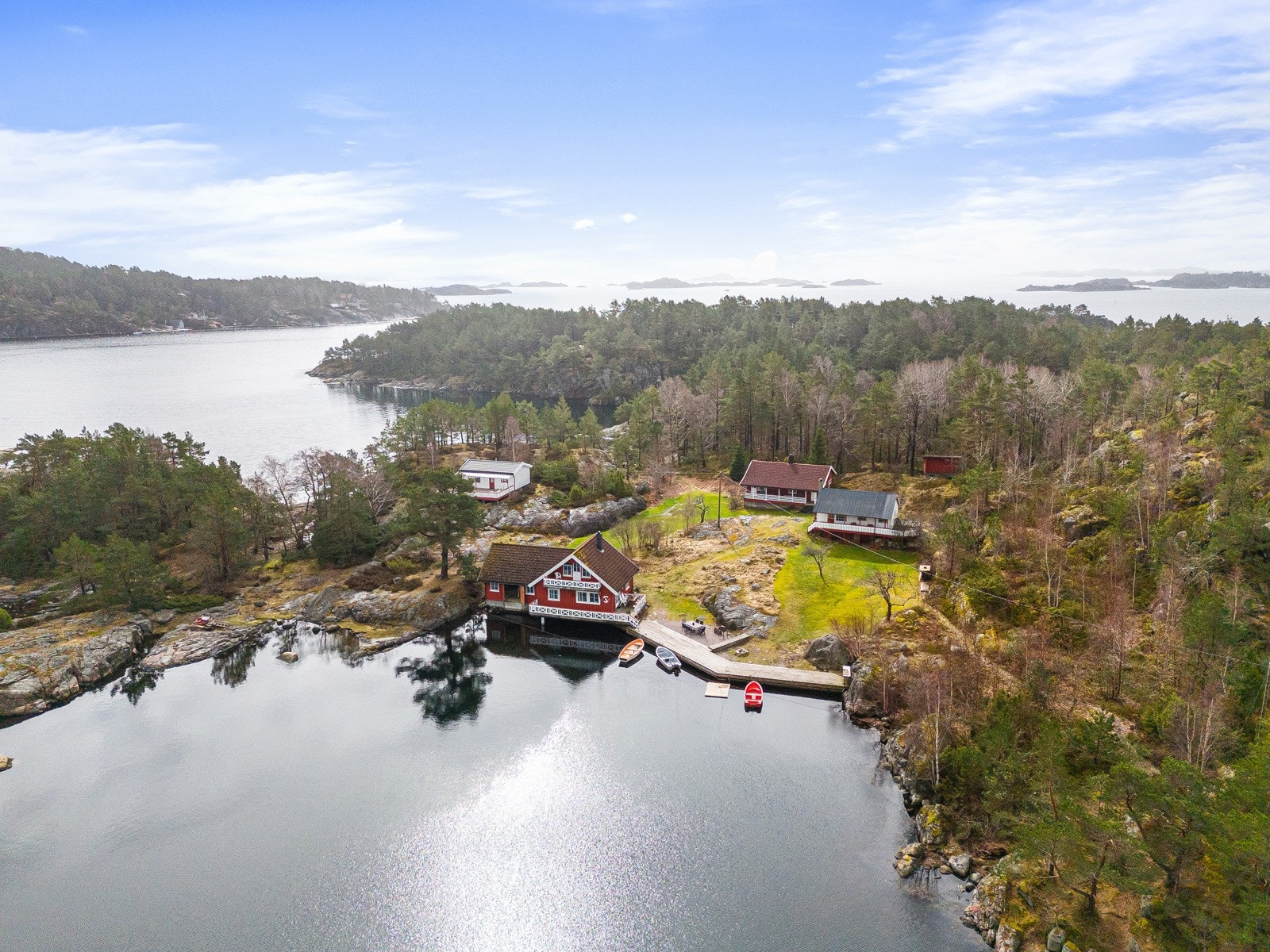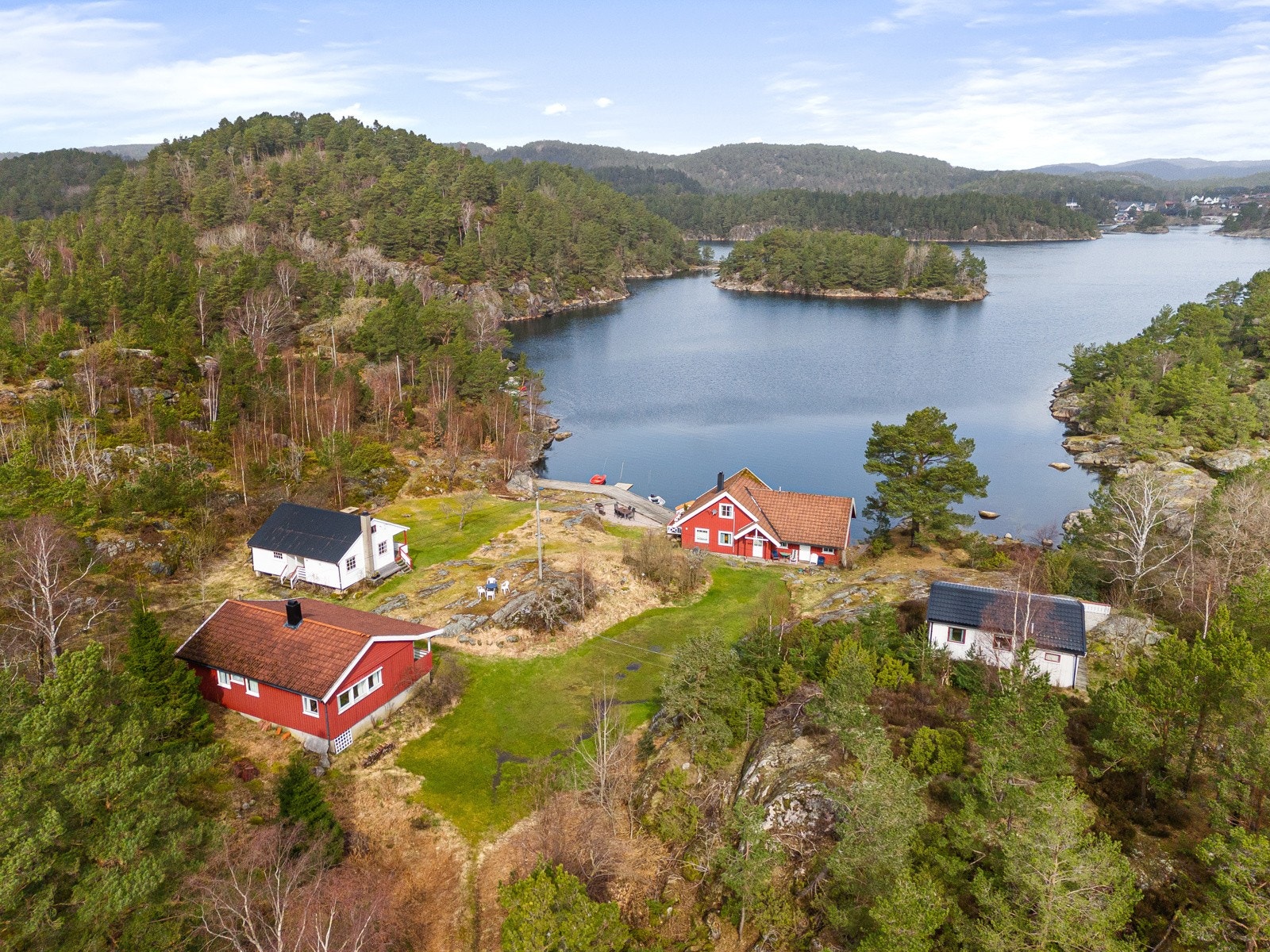 Søgne - Rivenes - utenfor Hummerviga - Stor fritidseiendom på over 47 mål med lang strandlinje, 2 brygger, og 5 hytter