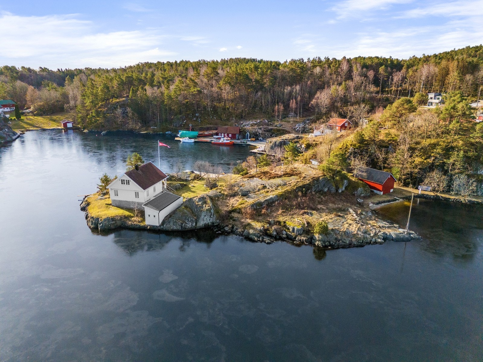 Lillesand - Høvåg -nær Blindleia - Fint landsted m/bilvei, lang strandlinje, hytte, anneks, båthus, brygge og sandstrand